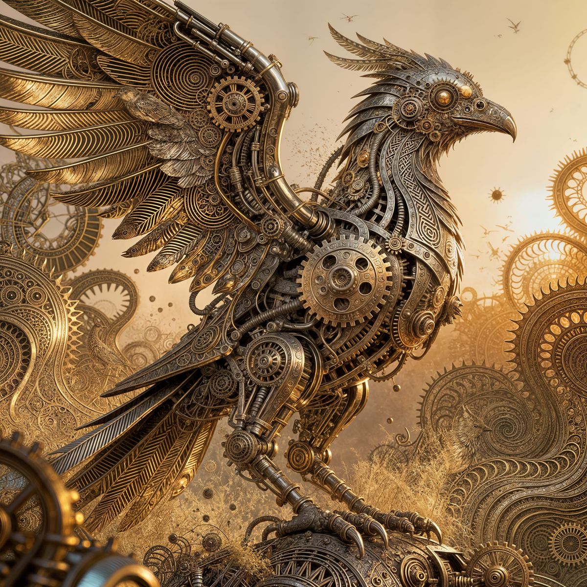 A highly detailed digital illustration of a mechanical phoenix amidst nature, featuring abstract fractals and wave patterns. Rendered with Zentangle art style and 3D shading, bathed in golden hour light.