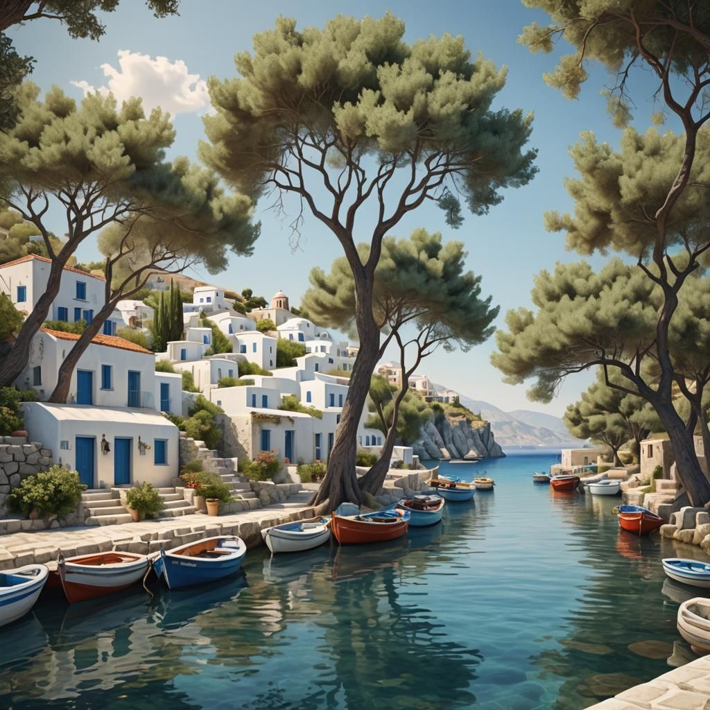 This image depicts a picturesque Greek village nestled by the sea. It features lush trees, boats gently sailing on the water, and a photorealistic rendering of the idyllic scene.