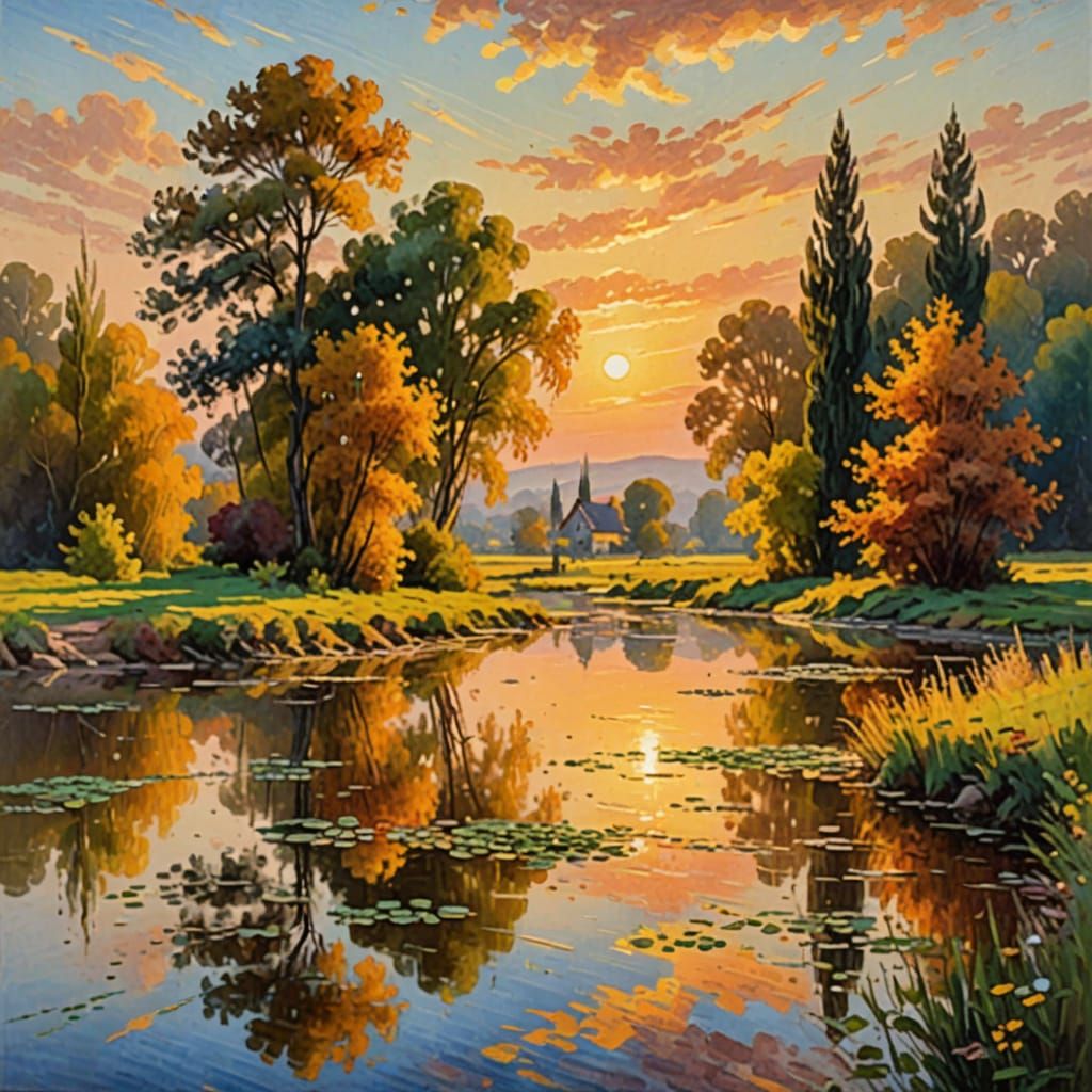 This oil painting captures a serene September landscape during golden hour. Enjoy warm light reflections and soft brushstrokes in a peaceful, idyllic scene.