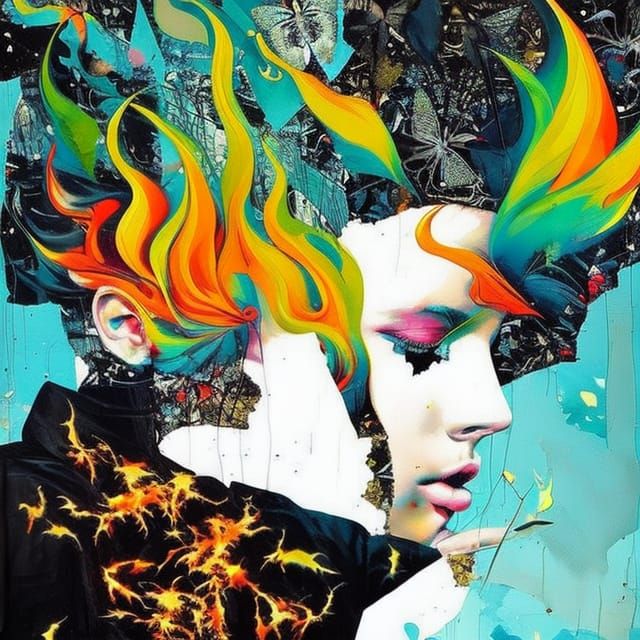A vibrant mixed-media collage of a person engulfed in flames with burning butterflies. The image features dramatic lighting, rough textures, and the style of fine art oil paintings.