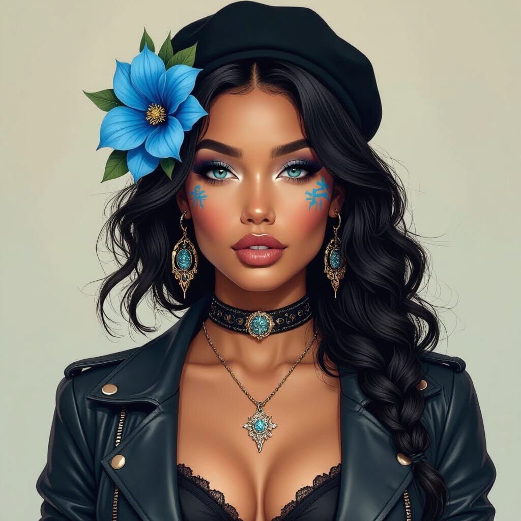 A striking picture of a woman with vitiligo and blue eyes, featuring a blue hydrangea tattoo. She wears a blue braided hairstyle, black beret, crop top, and paint-splattered leather jacket in a vibrant, detailed style.