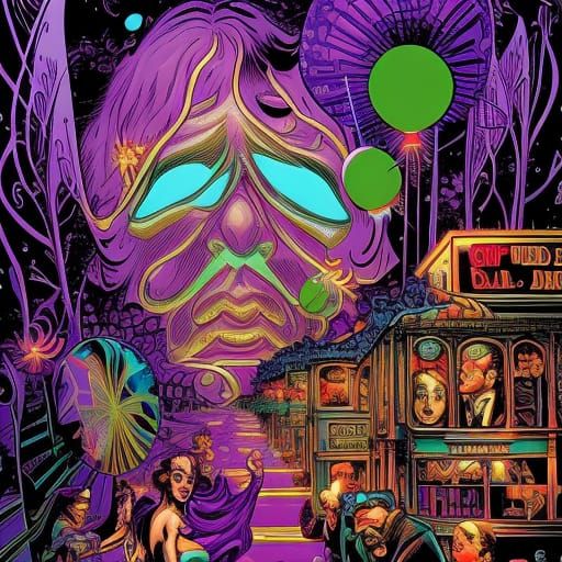 A vibrant comic book style image of a Mardi Gras celebration. The artwork features smooth lines and a psychedelic aesthetic, capturing the energy of the festival.