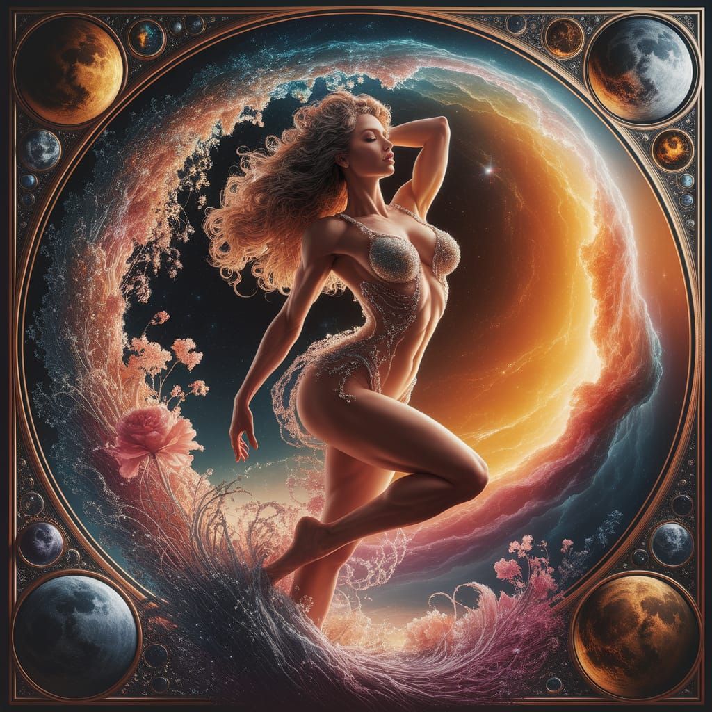 This image shows a strong woman posed beautifully in space. The background features planets, moons, and swirling nebulae, all rendered in a digital art nouveau style. Golden light enhances the cosmic scene.