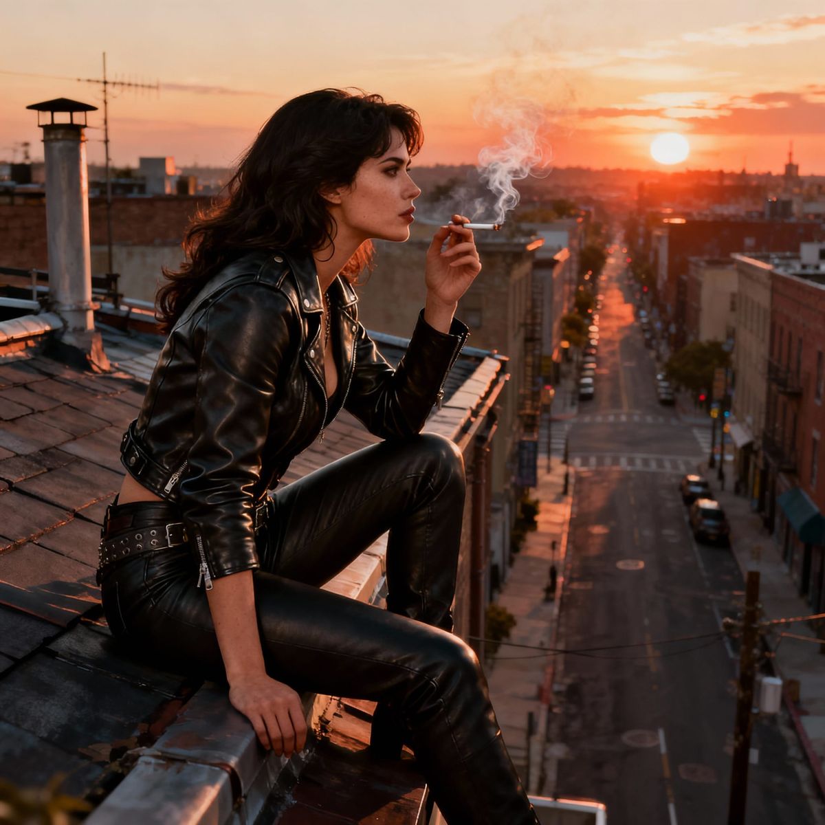A highly detailed, realistic panorama of a smoking brunette woman in leather sitting on a rooftop, looking down the street during a dramatic sunset. High contrast and cine lighting enhance the concept art.