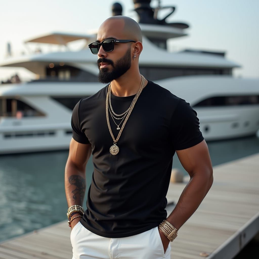 A realistic photograph of a bald young Egyptian man with a full beard and dark sunglasses. He wears gold jewelry and stands on a dock with a luxury yacht behind him, captured with soft bokeh.