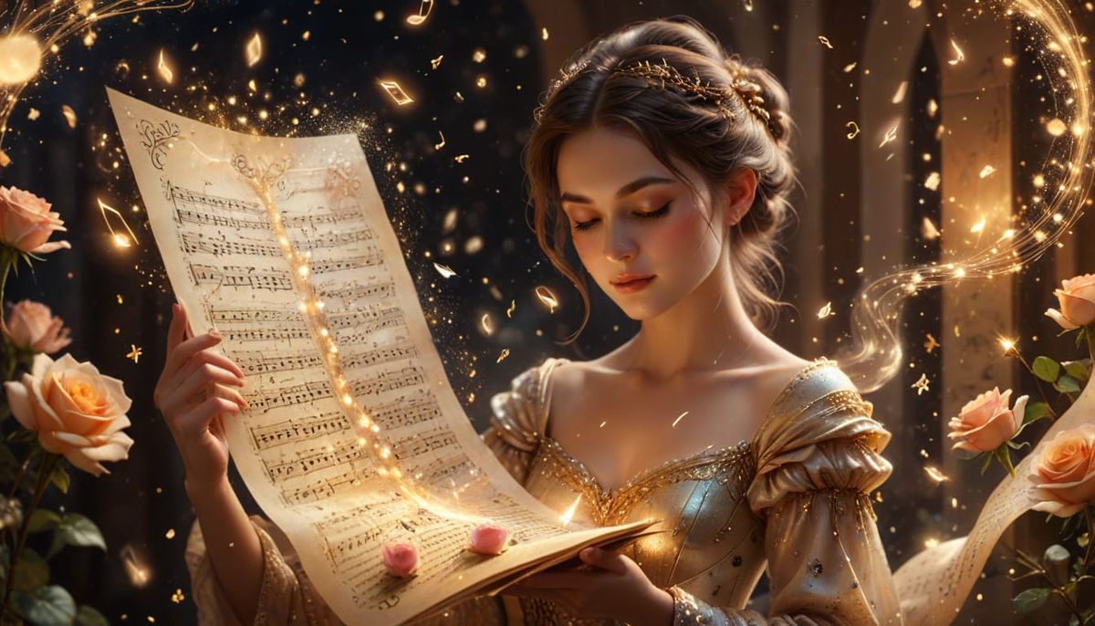vintage parchment, edged by timeless calligraphy and music notes. whisps of roses and falling stars. holographic projection of roses. translucent warm summer tones. breathtaking masterpiece. volume and depth lighting. sparkle, glitter, fantasy, magic.