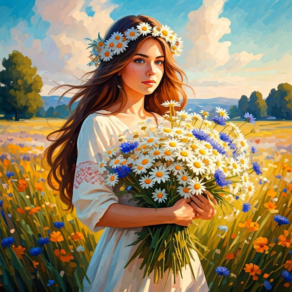 A vibrant image of a woman in a white dress holding flowers in a field. This vivid, impressionistic painting uses thick brushstrokes and complementary colors to capture a sunny day.