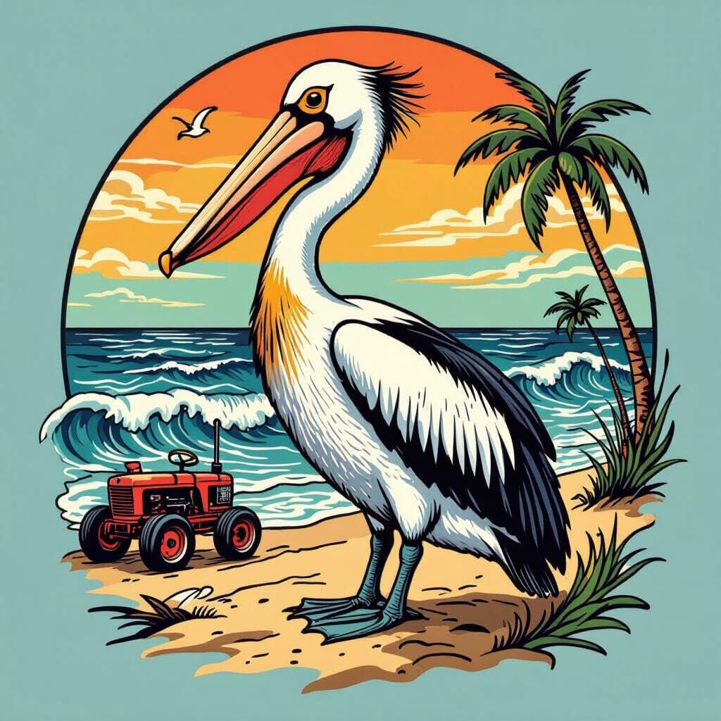 A vibrant neo-traditional tattoo style image of an Australian pelican perched by the ocean. Features bold outlines and saturated colors, with a whimsical yet realistic feel.