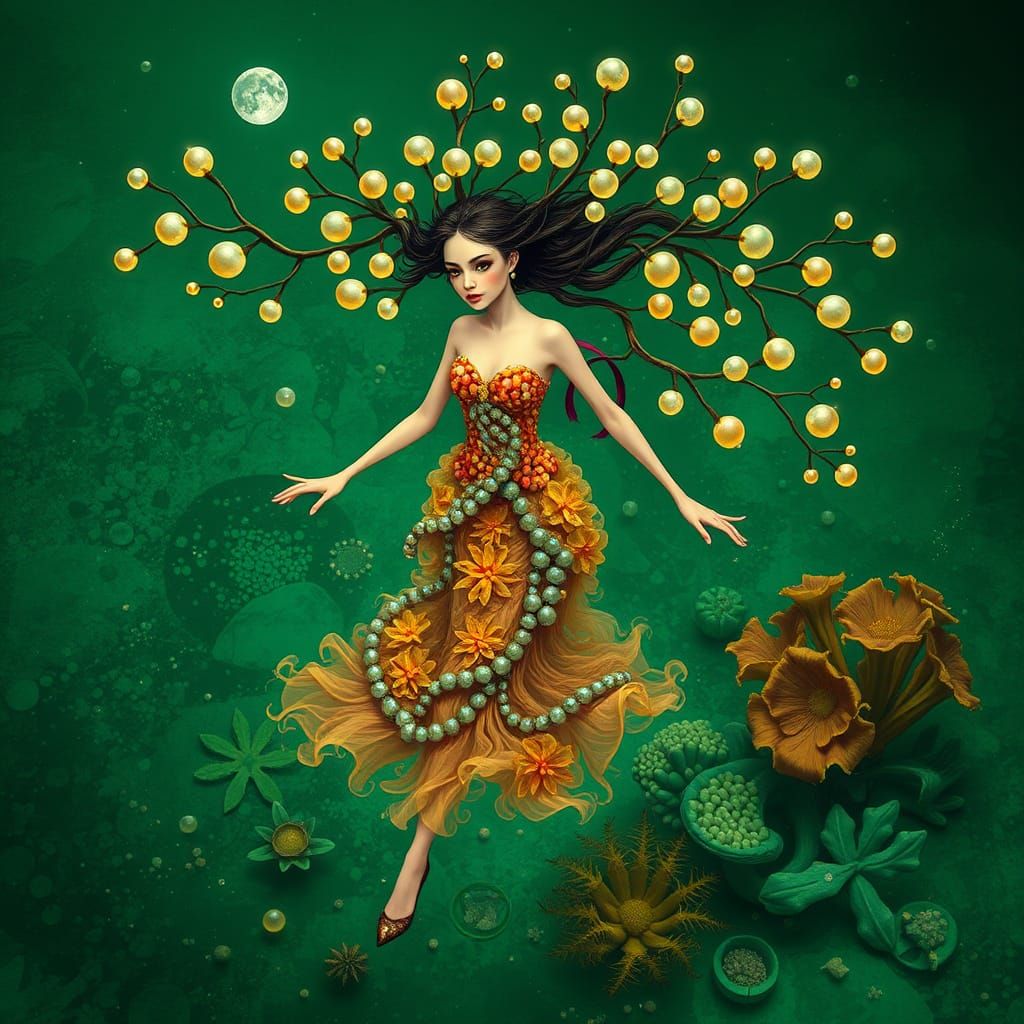 This image depicts a strong, determined figure walking on the ocean floor, surrounded by shimmering pearls and suspended water droplets. The scene is set against a vibrant green backdrop with mother-of-pearl accents, evoking a dreamlike atmosphere reminiscent of surrealist art.