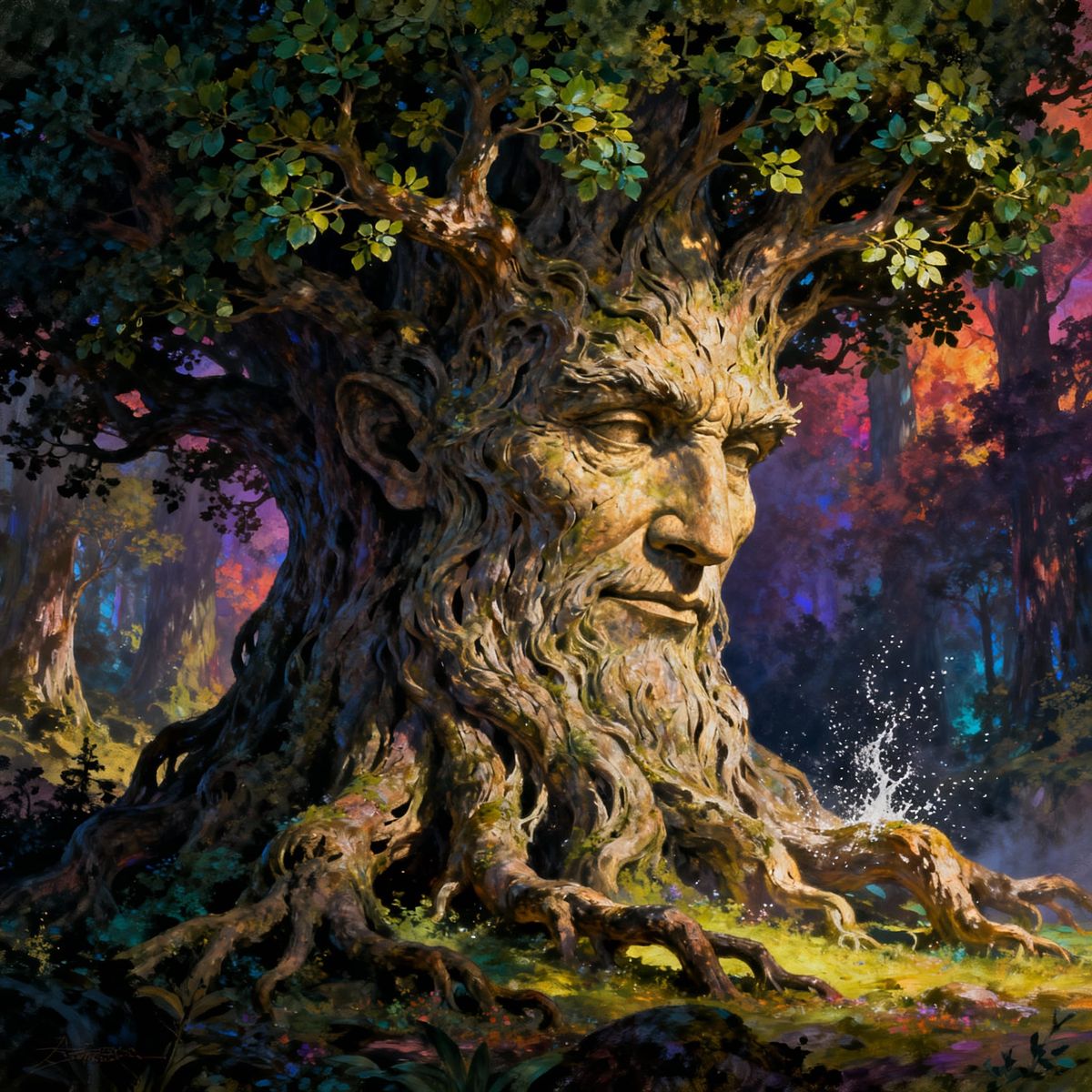 A colossal, ancient tree with a wise, benevolent face carved into its trunk.