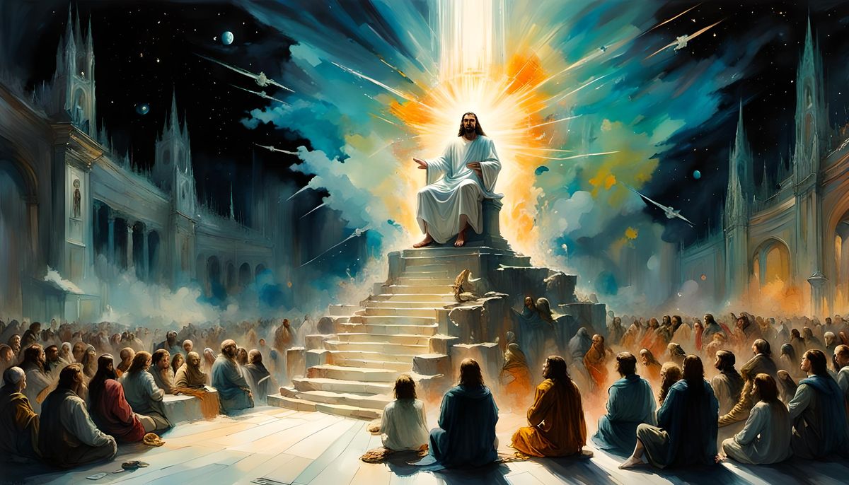 This image shows Jesus on his throne in heaven, surrounded by kneeling crowds. The artwork features space, fire, lightning, planets, and vibrant colors in a cosmic watercolor style.