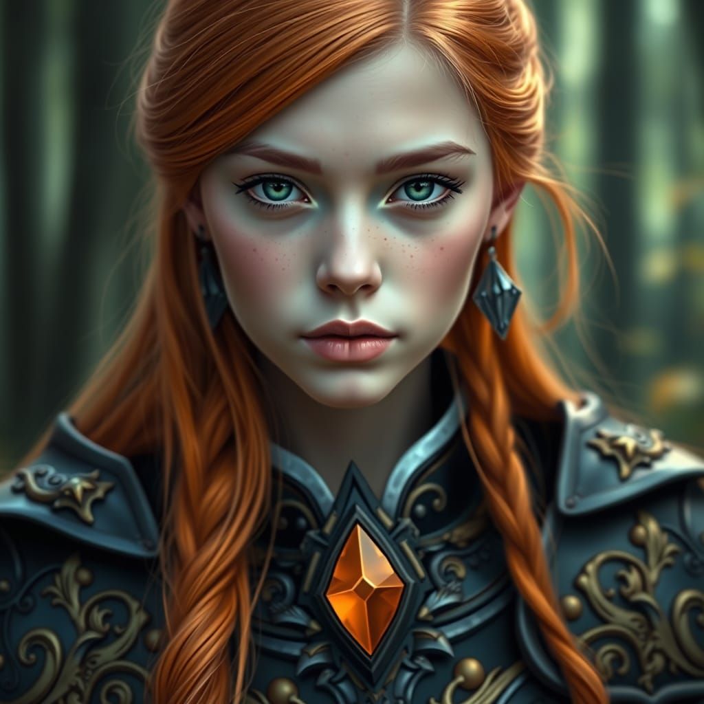This image shows a regal young woman with vibrant orange hair and piercing green eyes, clad in ornate black and gold armor amidst a mystical forest backdrop.