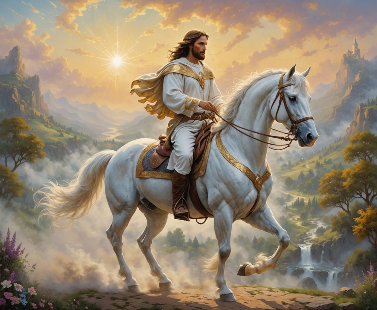 This stunning image depicts Jesus on a beautiful white Arabian horse, adorned with intricate gold bridle and saddle, set against a breathtaking heavenly landscape with ethereal mist.