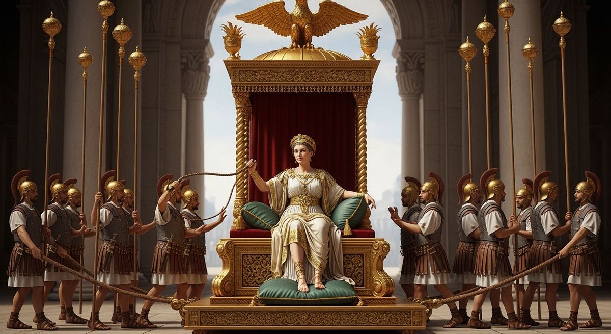 This image shows a Roman Empress seated on a golden throne, attended by bearers. She wears a gold toga embroidered with emeralds. The scene is lit by natural light, reminiscent of Baroque painting.