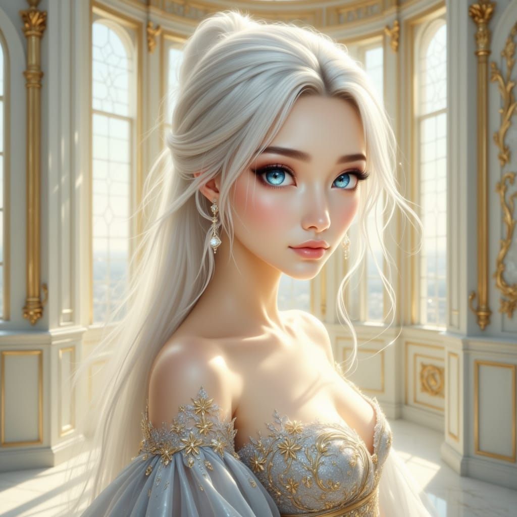 A beautiful anime-style portrait of a young woman with long, white hair and striking blue eyes. She wears an elegant gown with gold embroidery in a softly lit, airy room.