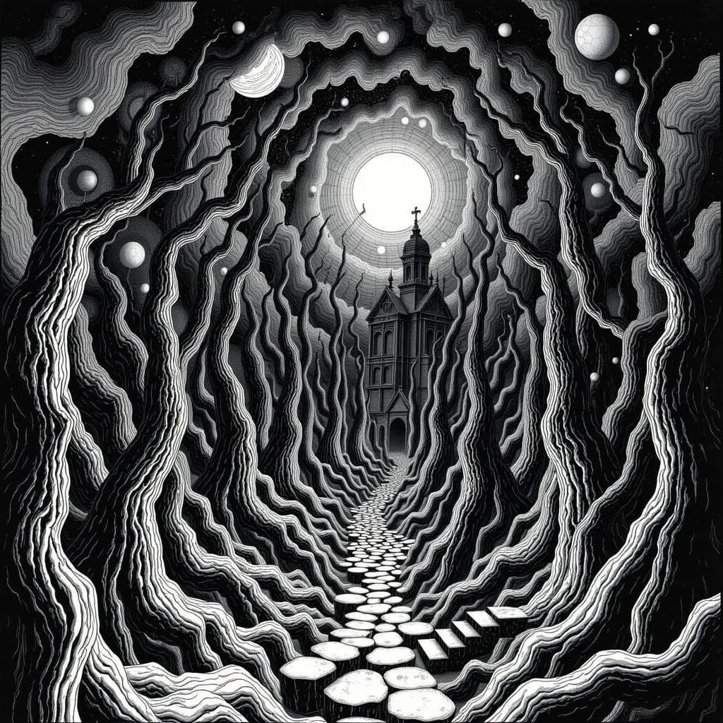 This image depicts the concept of evil's impact in a morbid, hyperdetailed style. It is inspired by the intricate, mind-bending art of M.C. Escher and the dark themes of Edgar Allan Poe.