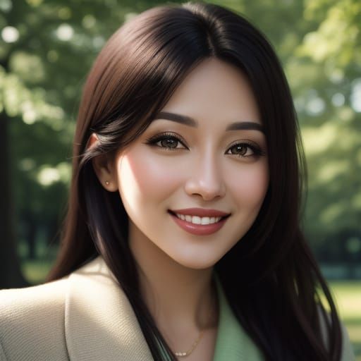 This image shows a close-up portrait of a smiling woman in a park. Warm sunlight illuminates her face, while soft shadows play on her clothes, set against vibrant green trees. The image has a realistic, cinematic quality.