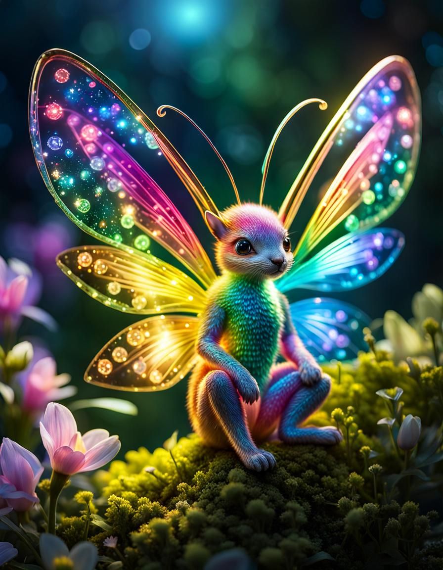 This image shows a radiant pixie with crystalline wings sitting on a glowing flower. Set in a lush forest, the scene is brought to life with bokeh and natural lighting.