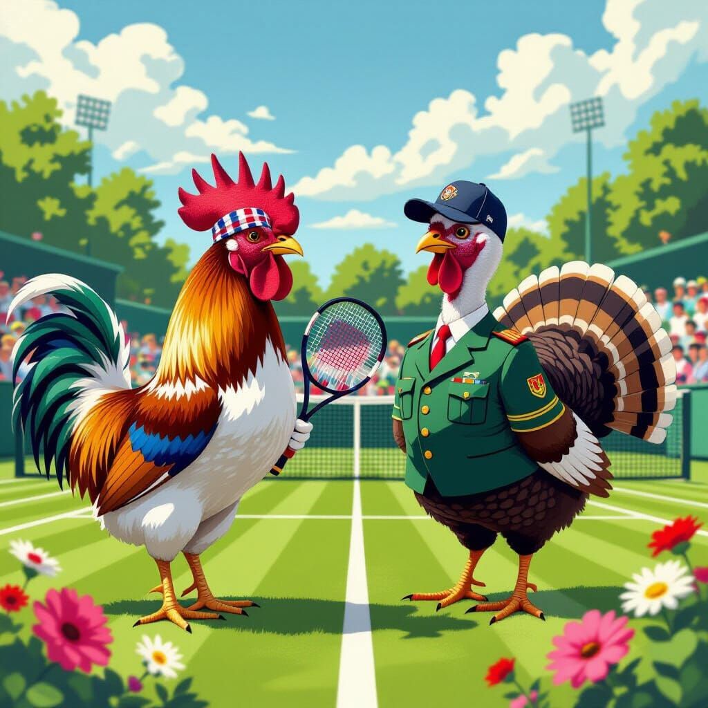 This image shows an anthropomorphic rooster playing tennis at Wimbledon against a turkey. The whimsical scene is surrounded by a crowd and flowers in a digital art style with bold lines and colors.