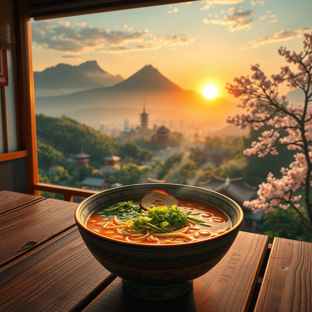 A steaming hot bowl of ramen sits on a wooden table, surrounded by Japan's serene landscape of lush mountains, traditional temples, and cherry blossom trees, all bathed in the warm glow of a golden sunset, blending traditional Japanese style with modern photorealism