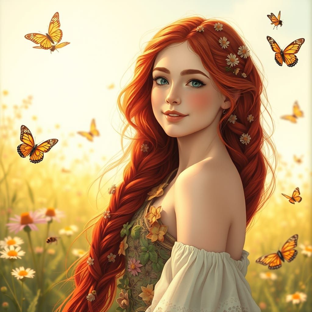 A radiant woman with braided red hair stands in a sun-drenched meadow filled with butterflies. Her floral gown and joyful expression are captured in an art nouveau style.