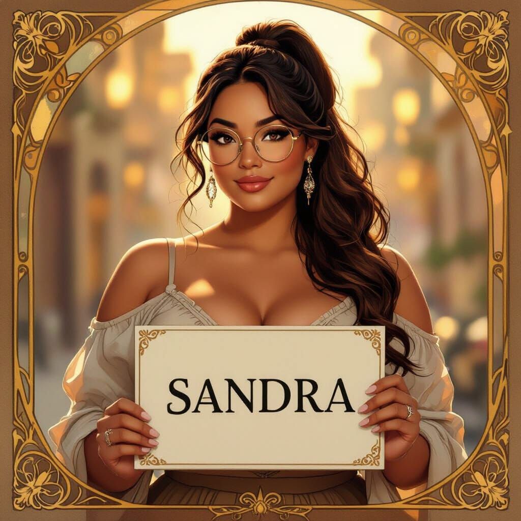 A portrait of a woman with cinnamon skin, glasses, and wavy brown hair in a half-ponytail, holding a sign. Rendered in an Art Nouveau style with warm, golden light.