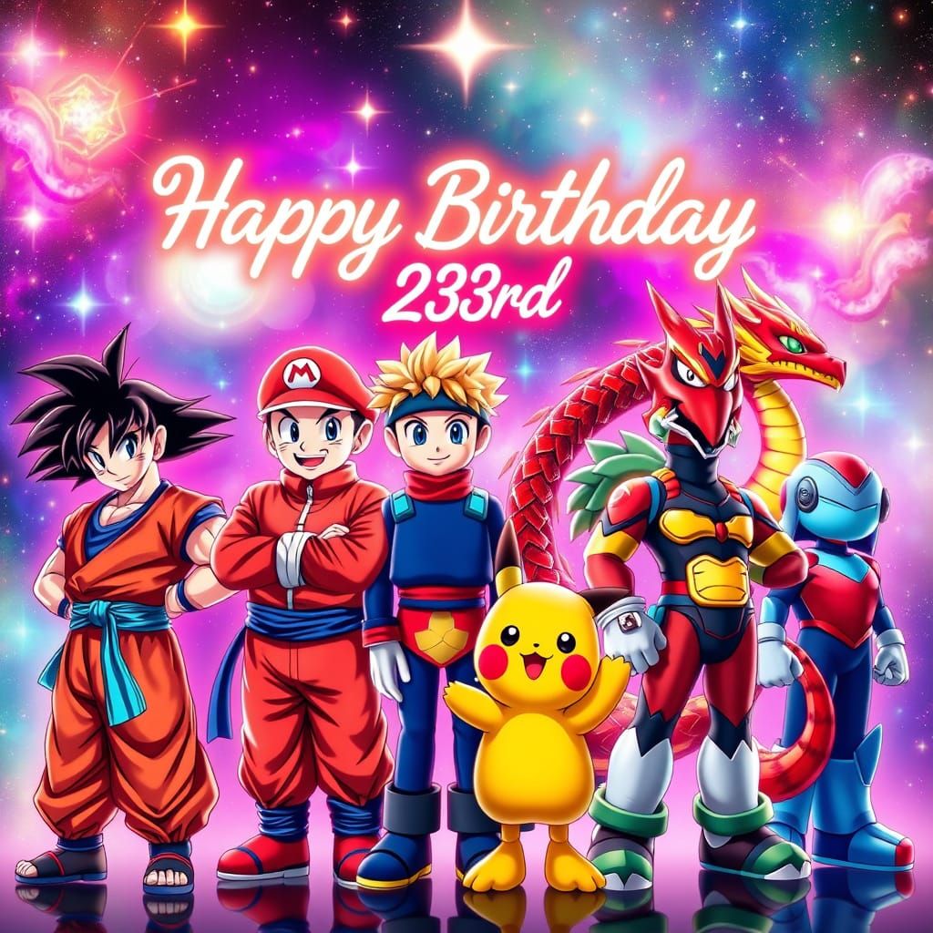 Today's my 23rd birthday ๐๐๐ง๐ง๐จ๐ฐ๐ช๐ฉ๐๐ฅก๐๐๐ฃ๐๐๐๐ซ๐๐๐๐๐๐!! Which is why I made this image with goku, naruto, mario, sonic, pikachu, Mega Man Rathalos X, A powerful, muscular, and heroic fox-dragon warrior god, A cosmic-astral phoenix-dragon hybrid swordsman, embodying the four seasons standing side by side. I'm planning to go a Japanese restaurant for my birthday.