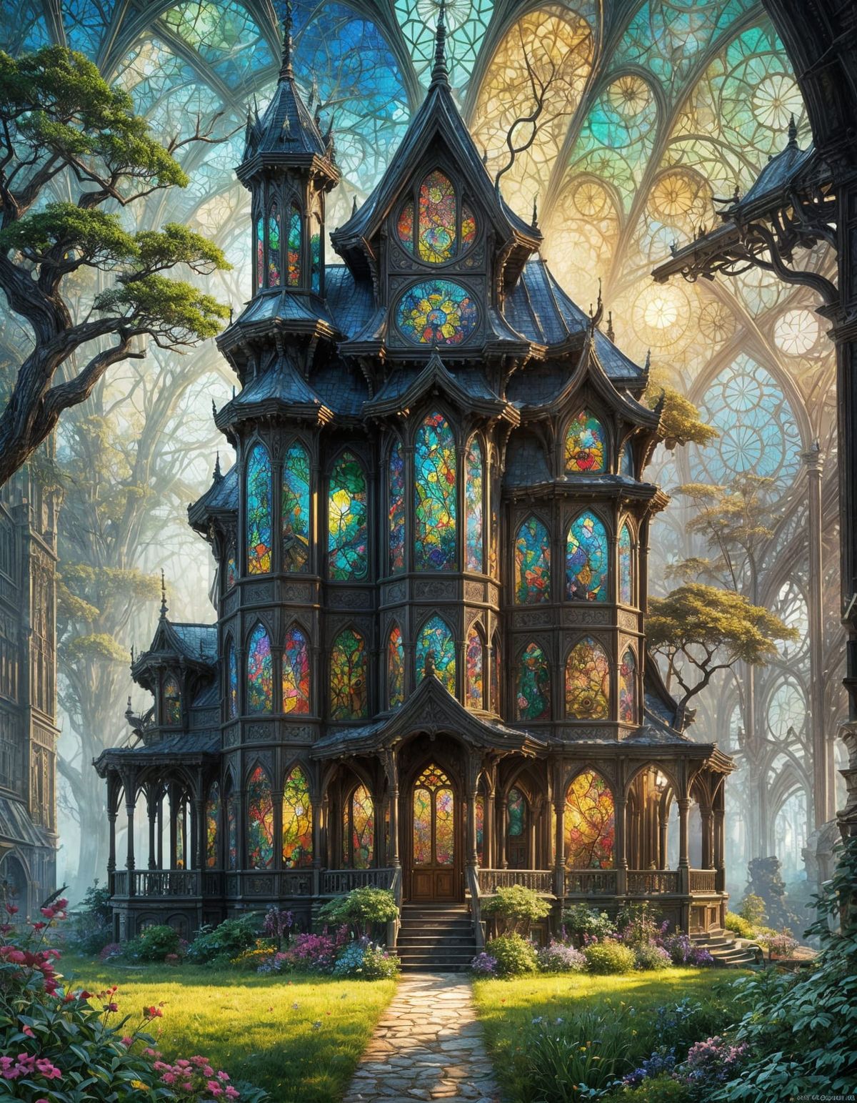 A stunning image of a stained glass house with intricate, reflective patterns against a dark enchanted forest backdrop at night. The artwork has a maximalist, detailed fantasy aesthetic.