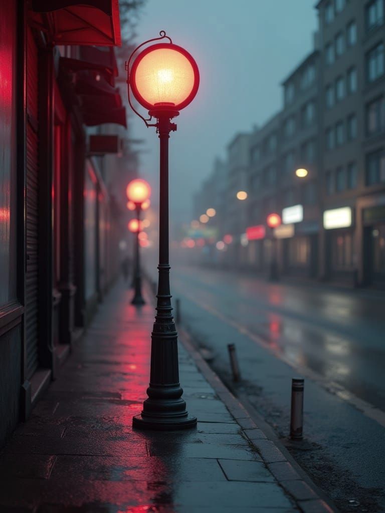 A striking picture of a futuristic lamppost casting a cold light on a rain-slicked city street. The focus is on the lamppost's reflection in a puddle, captured with photorealistic detail and hyperrealism.