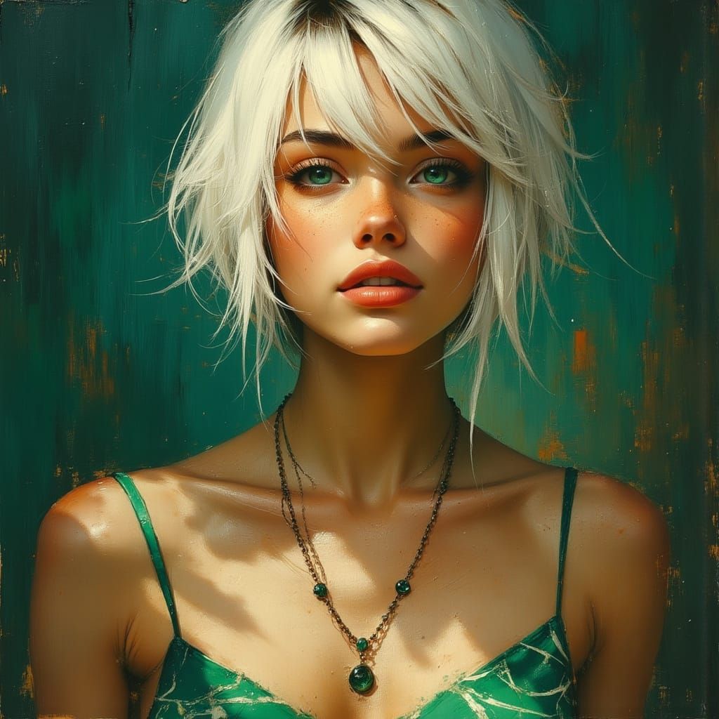 This image captures a full-body portrait of a painter with striking emerald eyes, an asymmetrical white bob, and intricate clothing patterns. The scene is dynamic with high contrast and sharp focus.