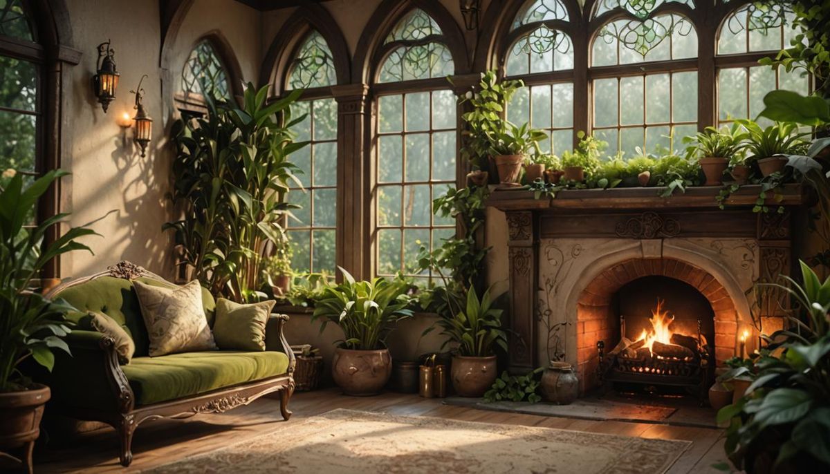 This image shows an elven sitting room interior featuring a fireplace, green plants, and intricate windows. The photorealistic scene is bathed in golden hour lighting and displays warm colors.