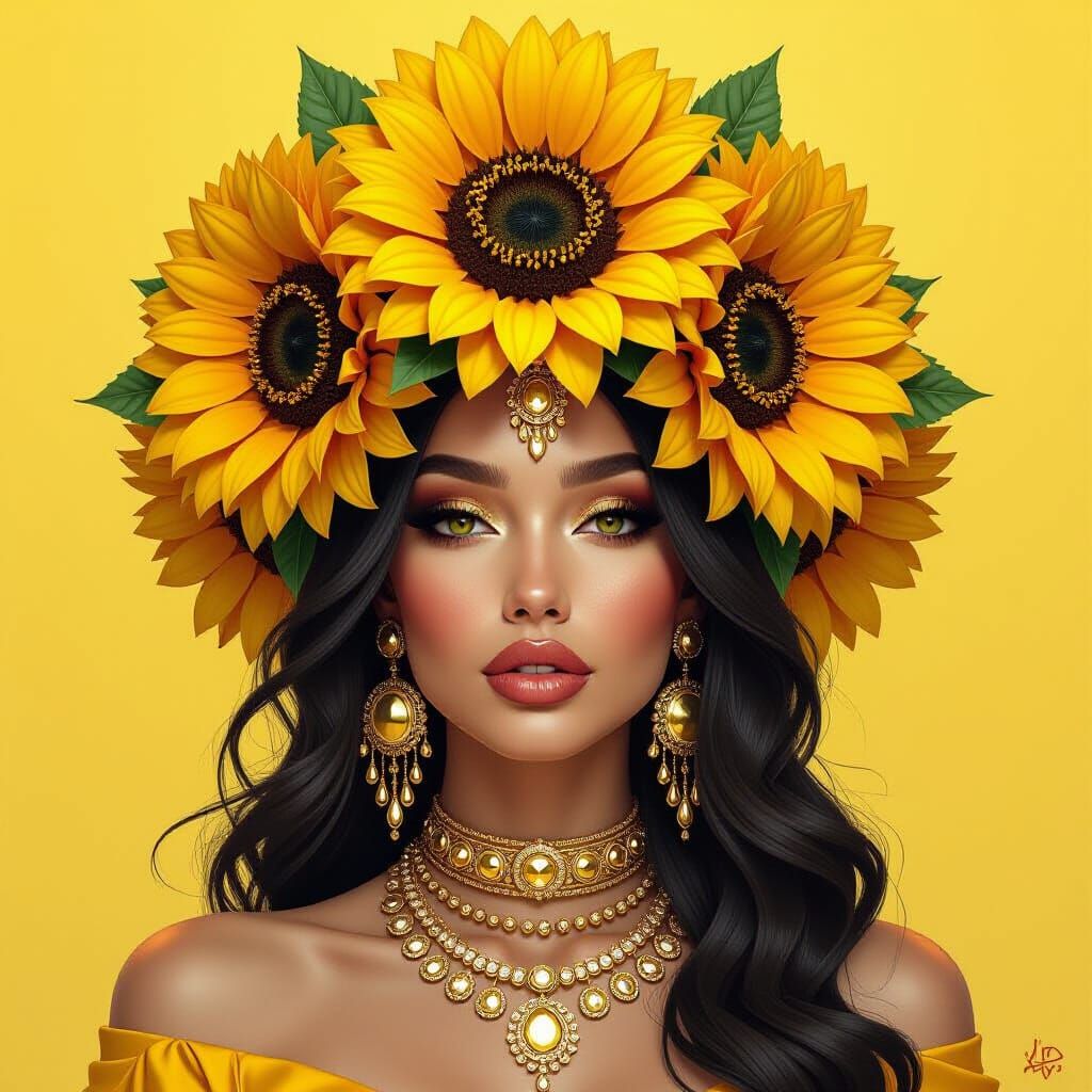 A high-fashion shot of a woman wearing a dramatic sunflower headpiece, adorned with layers of gold jewelry and intricate gold accents. The sunflower petals have a hyper-realistic texture, detailed down to the veins and shadows within the petals. Her gaze is confident and striking, framed by golden light ...