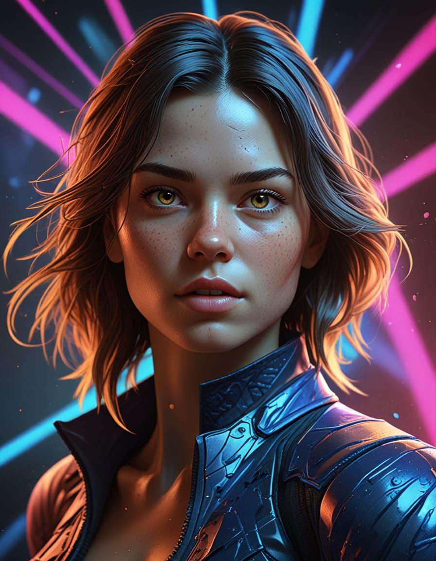 A digital illustration of a woman emerging from a dark background. The artwork features triadic colors, dynamic lighting, and intricate details, rendered as cinematic concept art.