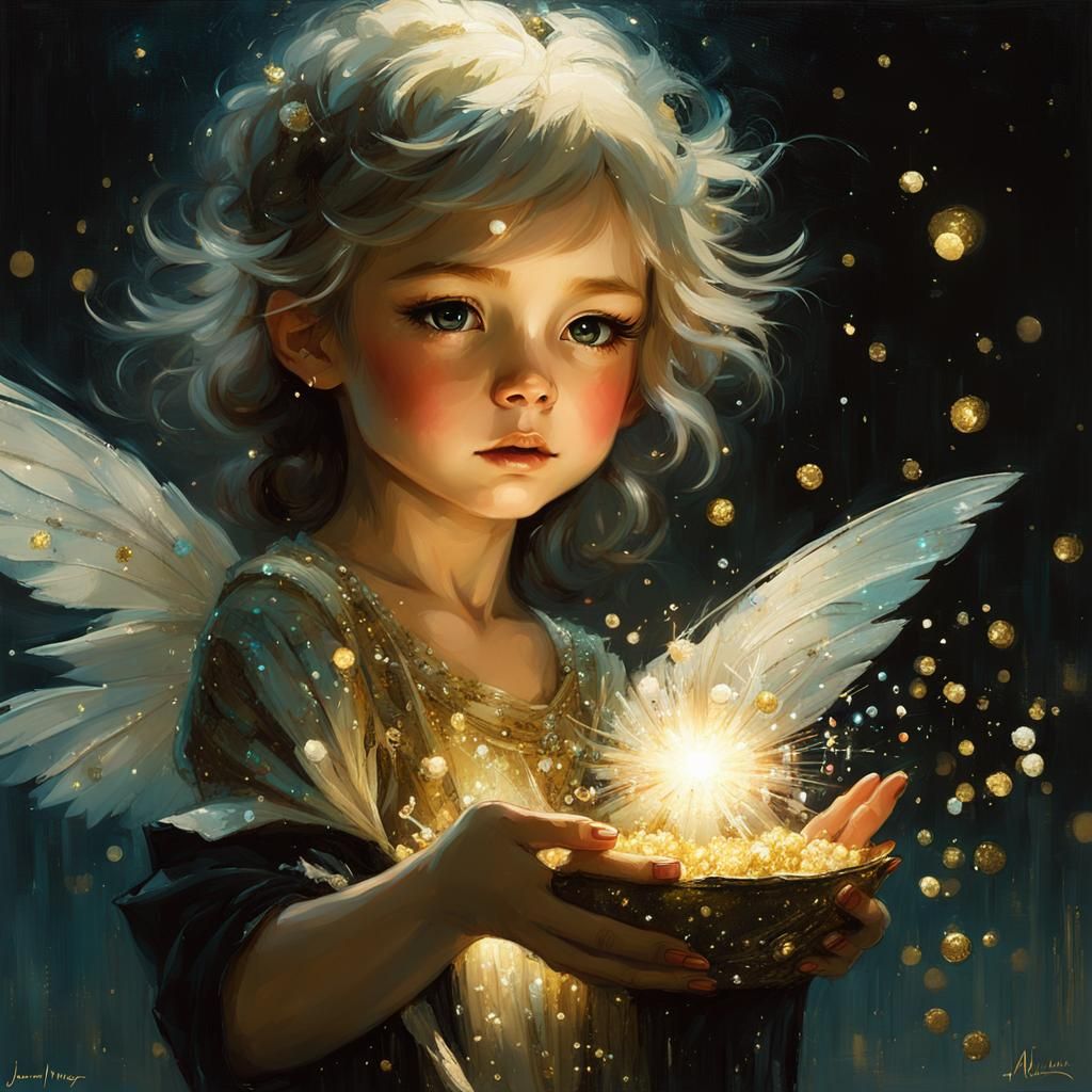 A digital painting of a chibi fairy throwing glitter from a pouch. The fairy has shining eyes, feathery wings, and wears a glitter-covered costume with intricate details. The artwork features dramatic, golden lighting.