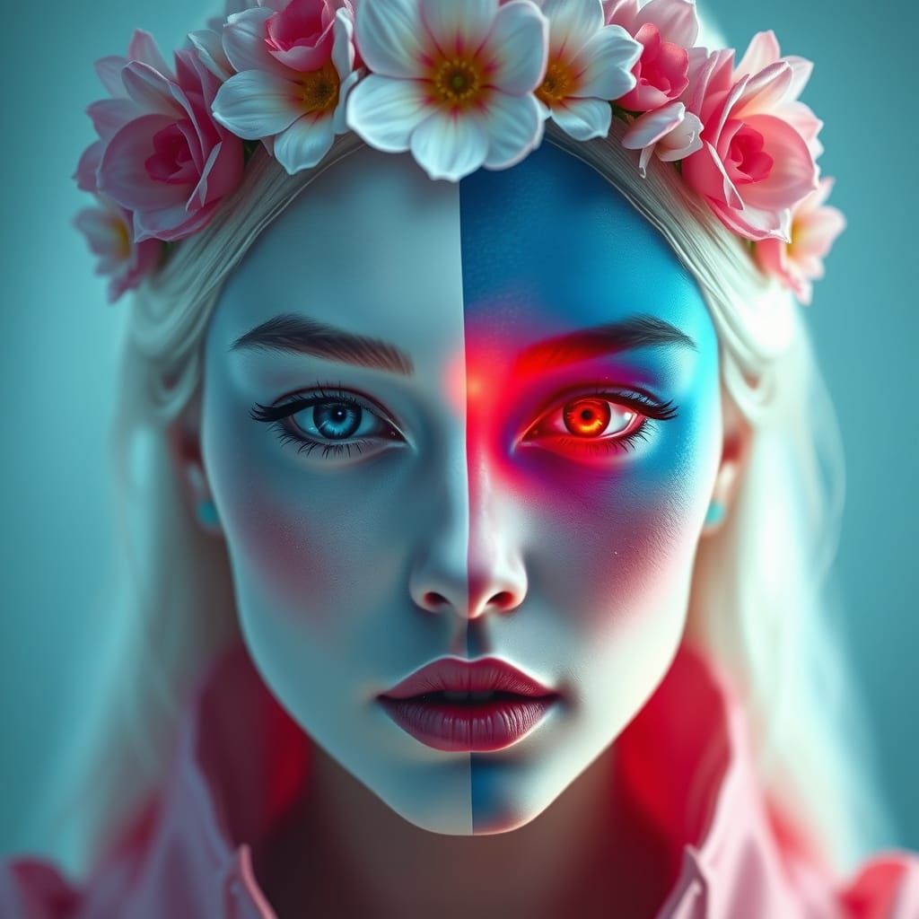 This image shows a stunning digital portrait of a woman with a split face, one half white and the other half blue, adorned with a delicate floral crown and a glowing red eye, set in a dreamy and surreal atmosphere with vibrant colors and high contrast.