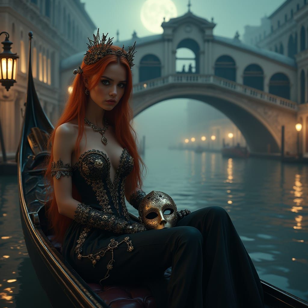 A striking image of a red-haired woman in a steampunk-inspired corset, seated in a gondola on Venice's Grand Canal. The scene blends metallic and gothic elements under moonlight, evoking a futuristic, industrial aesthetic.