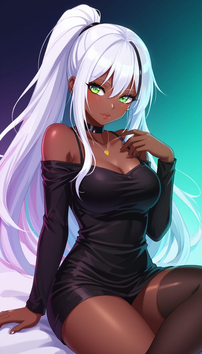 This image shows a dark-skinned anime girl with white hair in a ponytail, lying down. The character has green eyes and a delicate expression, rendered with vibrant colors and soft lighting in a digital anime art style.