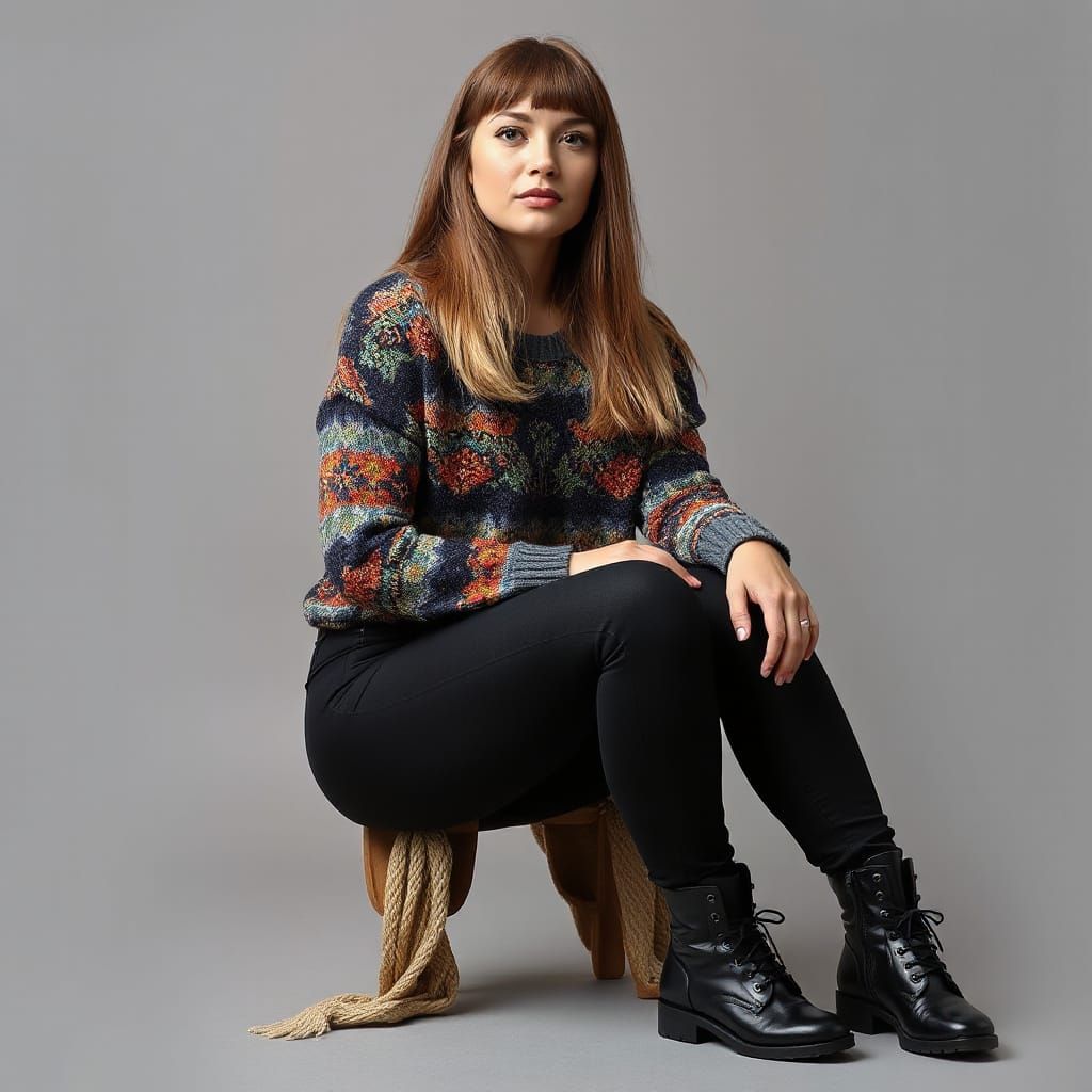 This image shows a confident full-figured woman in a colorful, knitted sweater and black jeans, striking a pose with long, curly brown hair and a touch of bohemian flair. Inspired by Art Nouveau aesthetics.