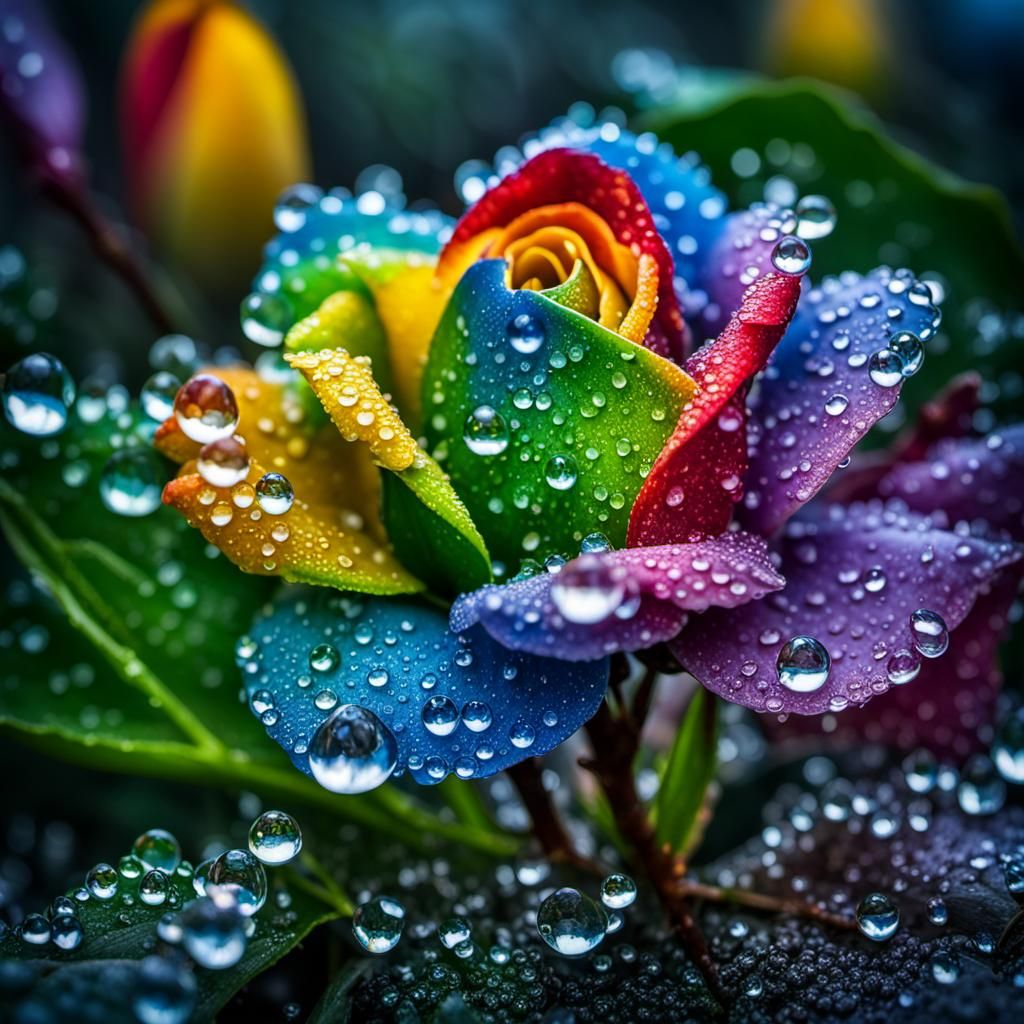 This image shows vibrant spring flowers covered in morning dew. The photograph captures intricate details with sharp focus, high contrast, and a cinematic, atmospheric mood.