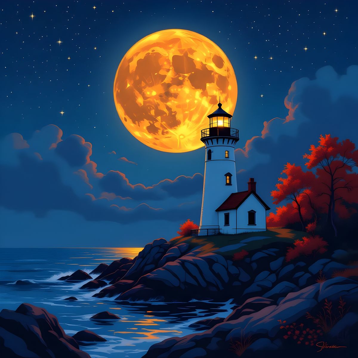 "On a jagged, wave-battered coastline, a solitary white lighthouse stands resolute, its bright beacon cutting through the darkness. Above it, an immense glowing orange moon swells in the star-strewn sky, draping the scene in fiery light. The surrounding trees blaze with autumnal reds and oranges, their colors deepened by the moon’s glow. Below, the restless ocean shimmers with molten gold reflections, mirroring both the lunar fire and the burning leaves. Waves crash and spray against the rocks, their silver foam catching fragments of moonlight. The scene is alive with texture and contrast — stillness in the lighthouse’s vigil, movement in the churning sea — evoking a sense of awe, warmth, and the raw power of the coast at night."