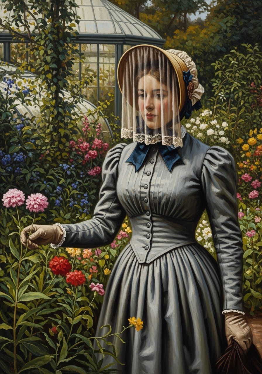 This image shows a veiled woman in Victorian dress exploring a lush botanical garden, rendered as an oil painting. The scene features visible brushstrokes, rich textures, and dramatic lighting reminiscent of 19th-century art.