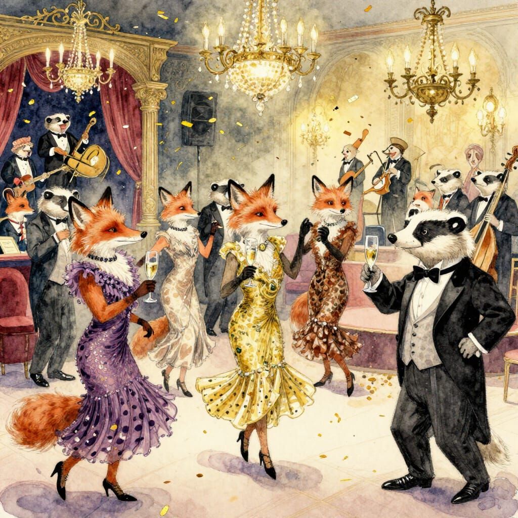 A detailed watercolor and ink painting captures a lively 1920s Parisian cabaret with anthropomorphic foxes and badgers toasting champagne amidst falling confetti. An otter jazz band performs.