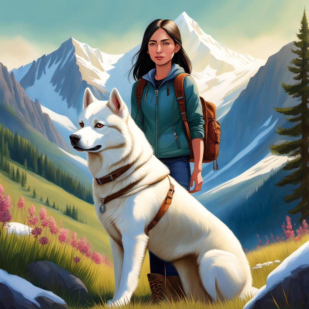 This image shows a beautiful, realistic depiction of a majestic white husky standing alongside a 14-year-old girl in a lush green valley, surrounded by vibrant flowers and snow-capped mountains. The scene is bathed in warm, golden hour sunlight with softly focused foreground and sharp mountain peaks.