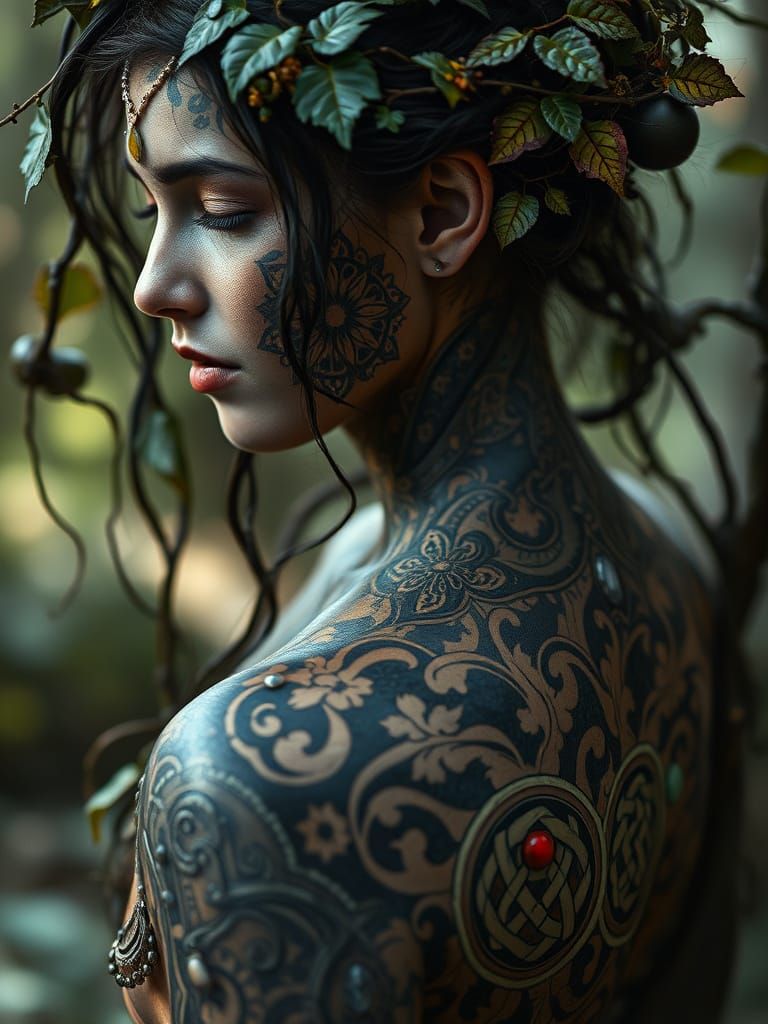 This image shows a dryad woman with a detailed mandala on her skin, featuring forest motifs, gemstones, and Celtic knots. Rendered with a dark fantasy aesthetic and cinematic lighting.