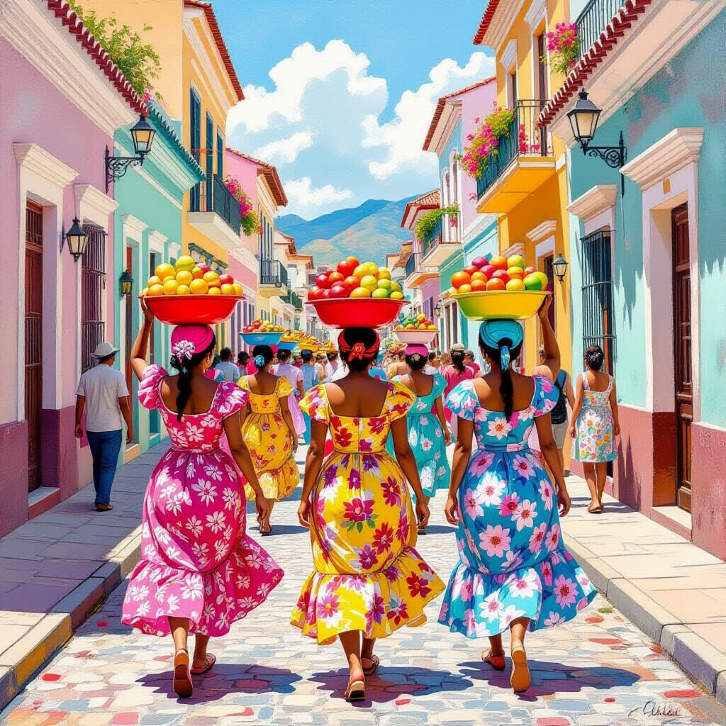 This image shows Palenqueras in vibrant dresses balancing fruit bowls while walking through Getsemaní's pastel streets. Colonial architecture is visible in this magical realist scene, with exaggerated forms and a whimsical aesthetic.
