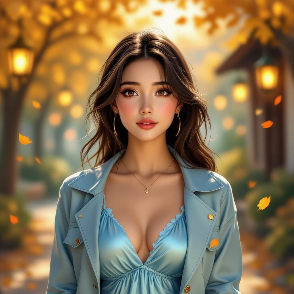 This image shows a young woman with hazel eyes walking through a glowing autumn garden filled with falling leaves and warm light. The style evokes realism with cinematic textures.