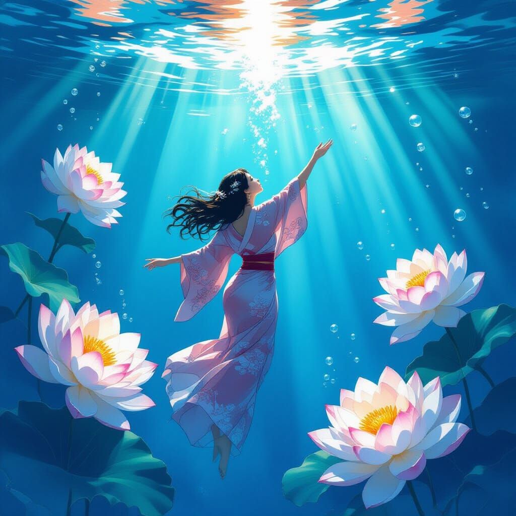 A digital watercolor of a woman in a silk kimono rising through blue water. Sunlight penetrates from above and below, illuminating lotus flowers trapped in glacial ice, in an art nouveau style.