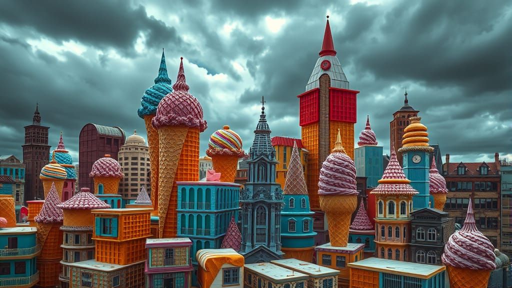 A hyperrealistic cityscape rendered in cinematic HDR, where buildings are crafted from colorful ice cream cones with waffle textures. The moody sky enhances the surreal, detailed architecture.