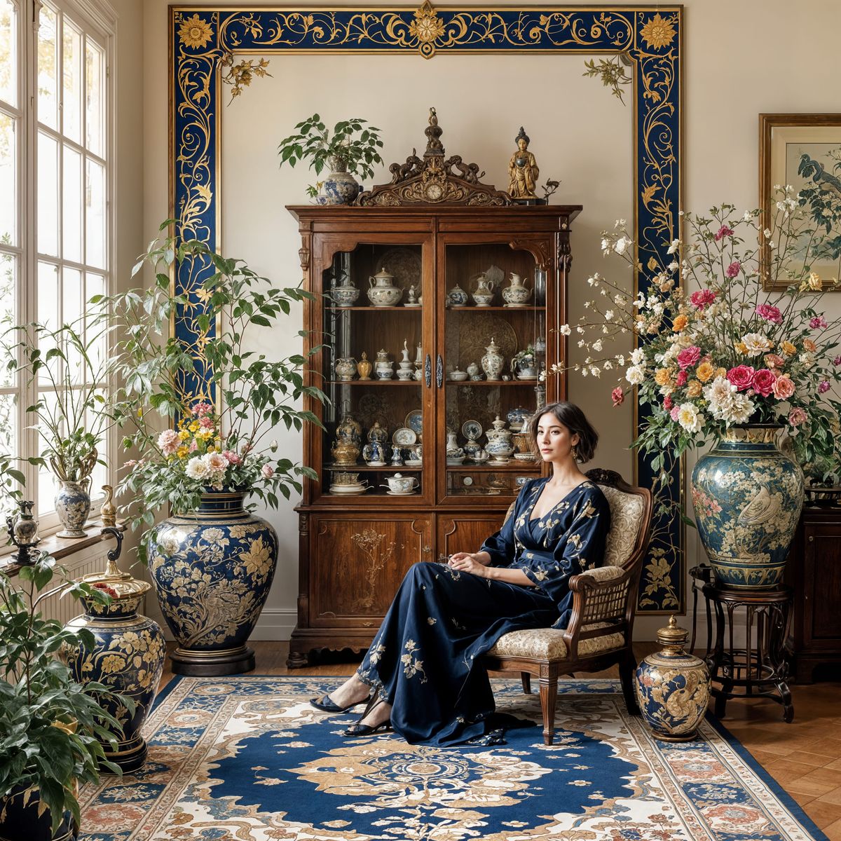 This image shows a serene room blending Art Nouveau and Japonisme styles. A dark blue and gold border frames the scene, highlighting Japanese art objects, ikebana arrangements and soft, mystical light.