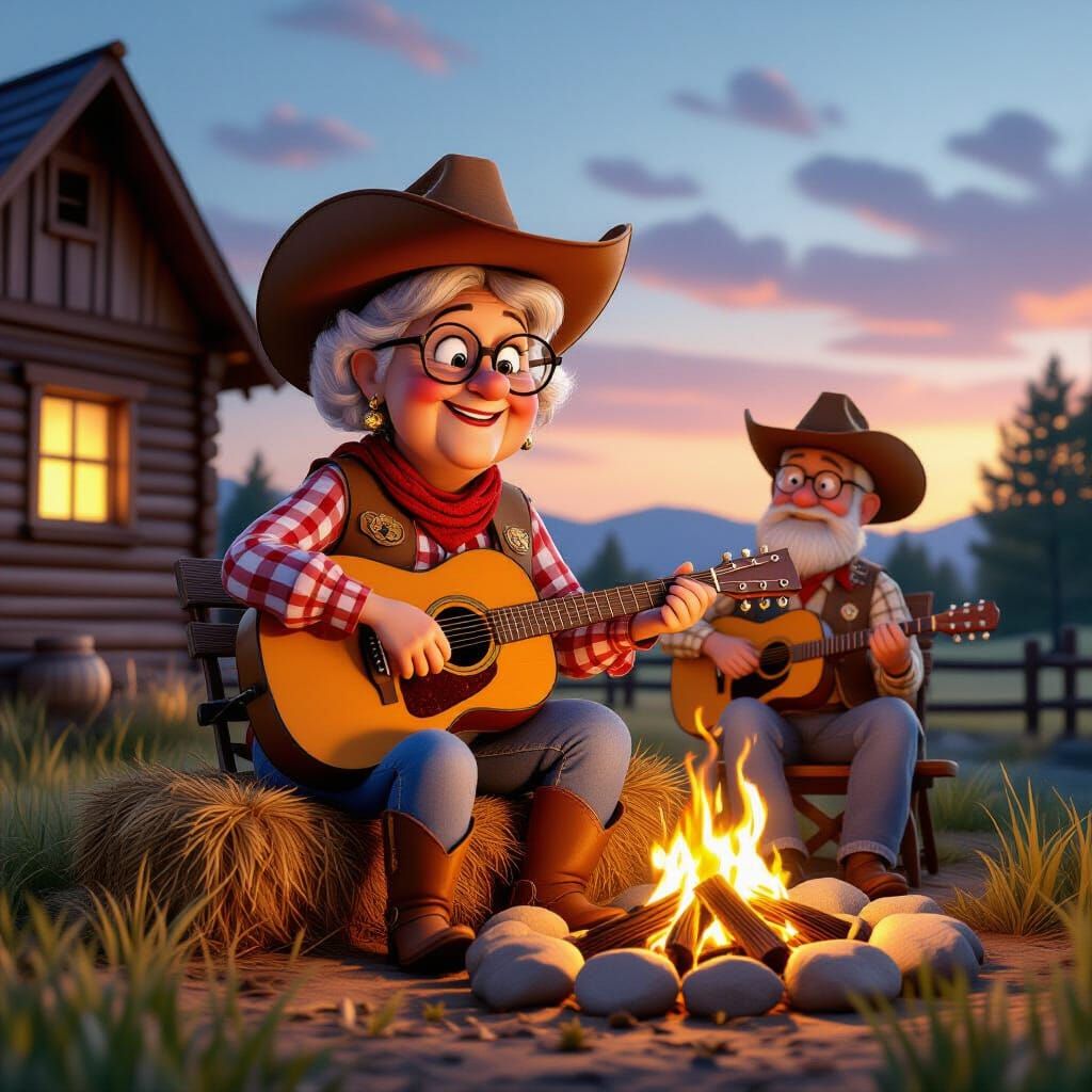 This image shows a very stout, grey-haired grandmother in a cowboy outfit playing country music by a campfire with friends. The scene is set in front of a barn, rendered in a vibrant Pixar-inspired 3D digital art style.